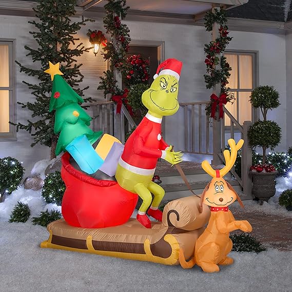 Grinch Inflatable Christmas Decorations Outdoor Decorate, Grinch and Max w/Sleigh Scene Dr. Seuss, 6.5 ft Tall