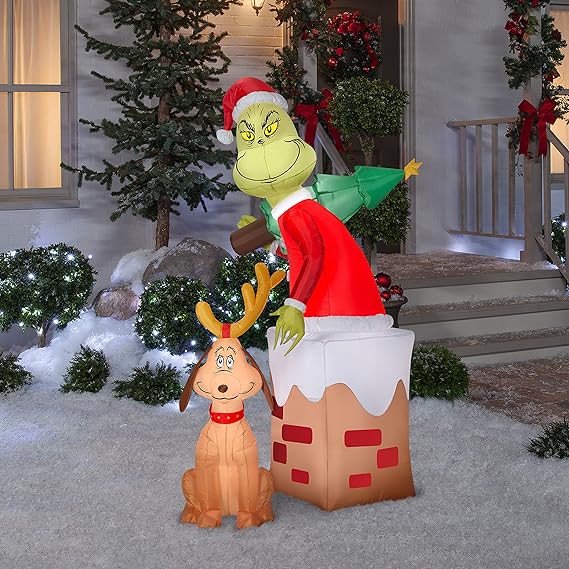 Christmas Air blown Inflatable Grinch in Chimney w/Max Scene Dr. Seuss, 5.5 ft Tall