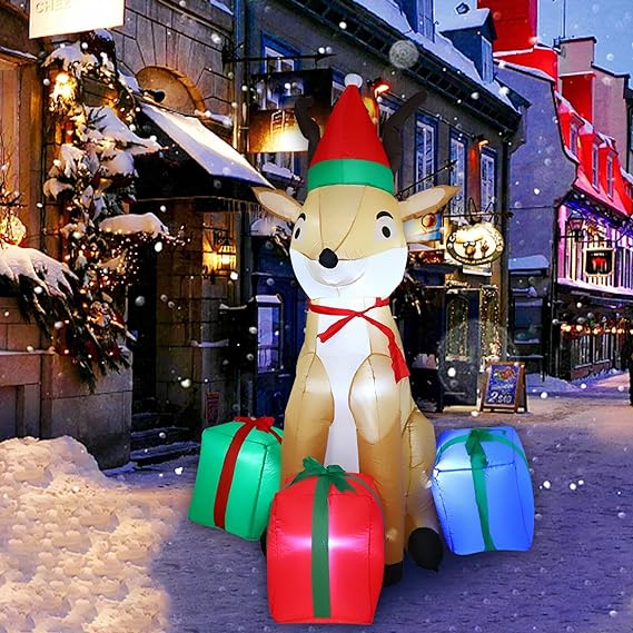 8 FT Christmas Inflatable Reindeer with Gift Boxes, Blow up Lighted Xmas Yard Decor with LED Lights for Christmas Outdoor Yard