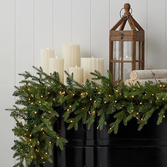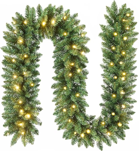 9FT Pre-Lit Artificial Christmas Garland with 50 LED Lights and Realistic Classic Evergreen Pine Spruce for Mantle Stair Railing Indoor Outdoor