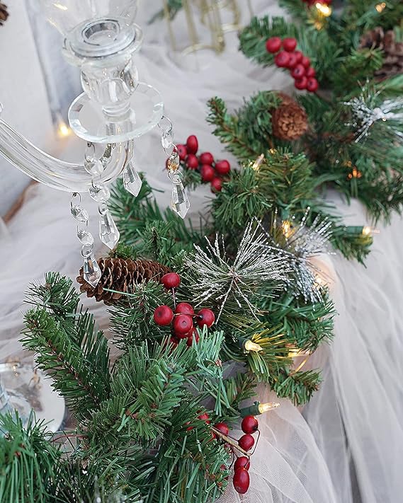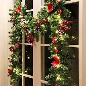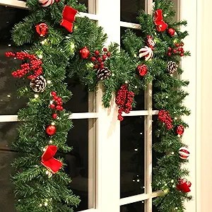 MorTime 9 FT LED Christmas Garland with Pinecones Red Berries Bows Christmas Balls Candies, Multi-Function Christmas Garland with 50 Warm White LED Lights, 180 Branch Tips