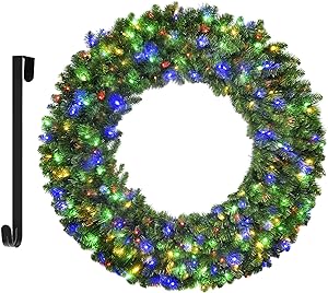 48 Inch 4 FT Large Christmas Wreath – Pre-lit Plug-in Outdoor Christmas Wreaths with 210 Colorful 8 Modes LED Lights, Hanger, Xmas Decorations for Door Outdoor Indoor Wall Home