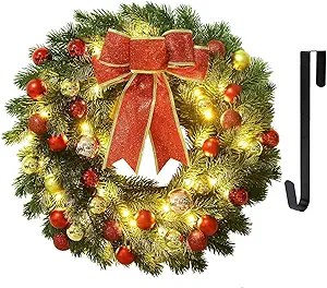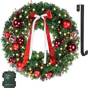 24″ Christmas Wreath with LED String Lights and Ball Ornaments- Artificial Pine Prelit Christmas Door Wreath Garland Battery Operated with Timer – Including Wreath Hanger, Ornaments Decorations