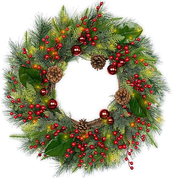 Christmas Wreath, Artificial Christmas Wreaths with Lights Battery Operated Large Christmas Wreaths for Front Door Outside with Red Berries Pine Cones and Ball Ornaments (24inch)