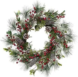 24 in. Pre-Lit Artificial Christmas Wreath Wintry Pine with 50 Warm White LED Lights, Battery Operated, Adorned with Pinecones, Red Berries, Holly Leaves and Snowflakes