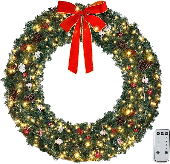 48 Inch Pre-lit Artificial Christmas Wreath, Ourdoor Christmas Wreath Decorations with 150 LED Lights and 450 PVC Branch Tips for Garage, Xmas Door Wreath w/Bow, Pine Cones, Ornaments, Plug-in
