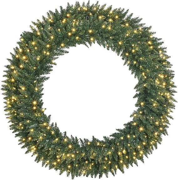 60 inch Large Artificial Pre-Lit Fir Christmas Wreath with 300 LED Lights, 722 PVC Branch Tips, Holiday Decoration for Door, Power Plug-in, Green