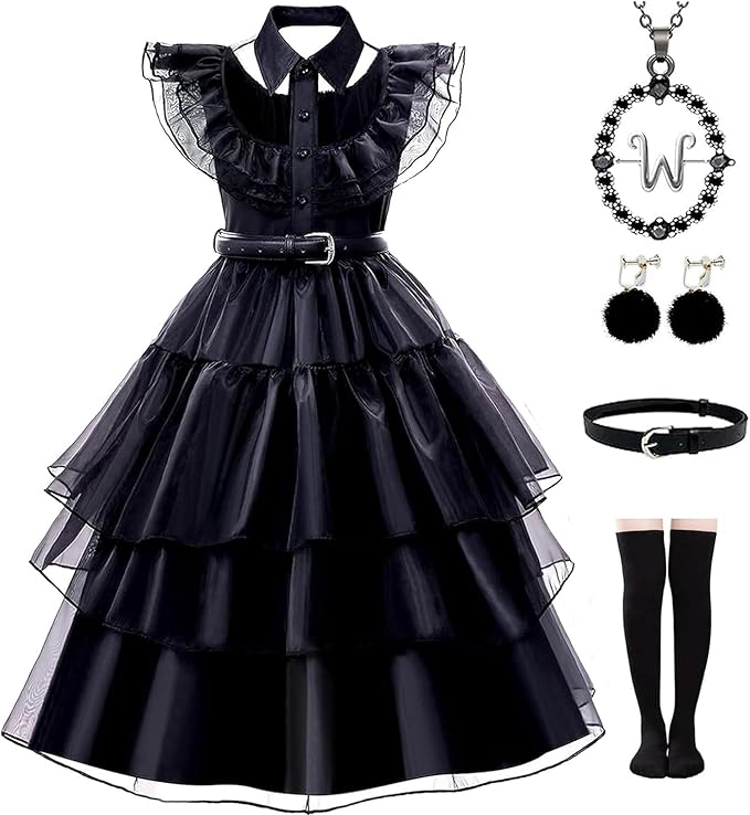 Black Costume Dress Wednesday for Girls Halloween Costumes Cosplay Party Dress with Accessories