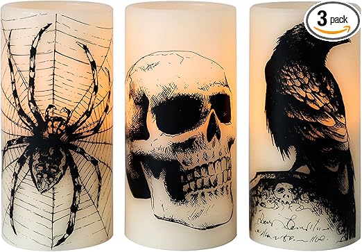 Halloween Flickering Candles with Skull, Spider Web, Crow Raven Decals Set of 3, Battery Operated Halloween Themed LED Candles Horror Spooky Decoration
