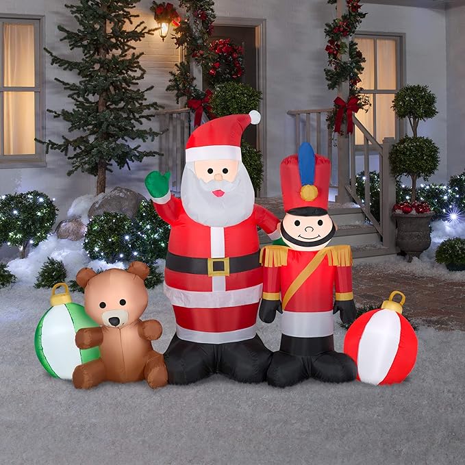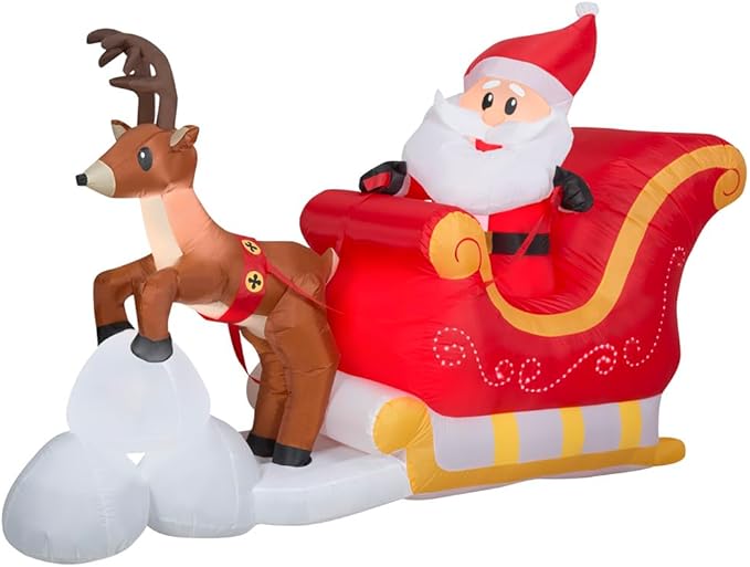 Gemmy Santa and reindeer inflatable Christmas decorations bring a festive and whimsical charm to outdoor holiday displays. These inflatables often feature Santa riding a sleigh pulled by reindeer or playful reindeer frolicking alongside Santa in a winter wonderland scene. Known for their vibrant colors, durable materials, and easy setup, Gemmy inflatables are perfect for creating an eye-catching centerpiece in your yard. Many models include energy-efficient LED lights, making them stand out beautifully at night, while some even feature animated movements, adding extra magic for kids and guests. These decorations embody the joy and wonder of Christmas, making them a must-have for any holiday enthusiast.