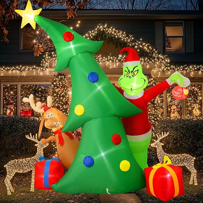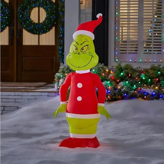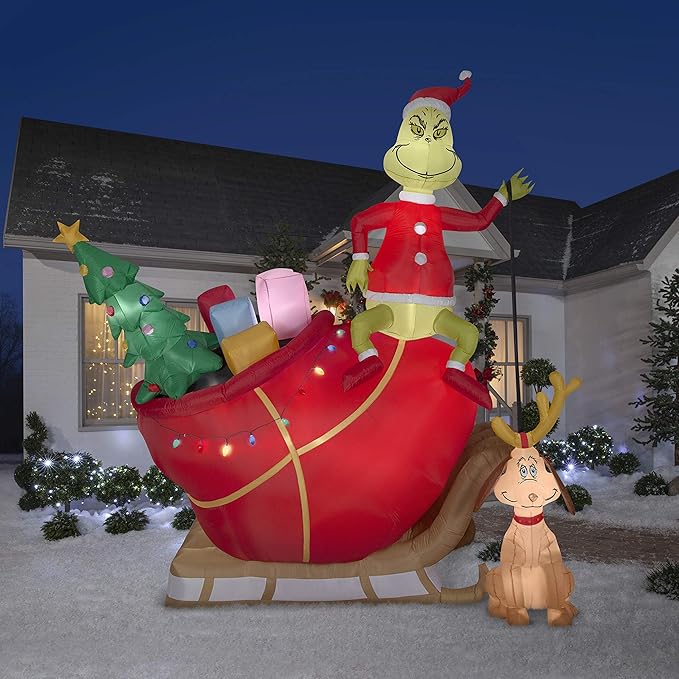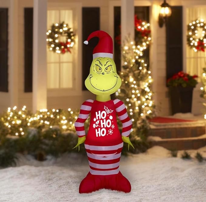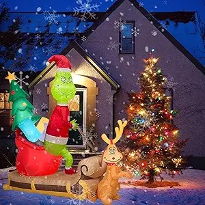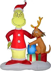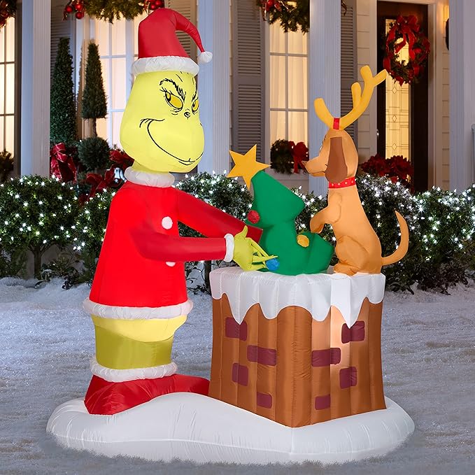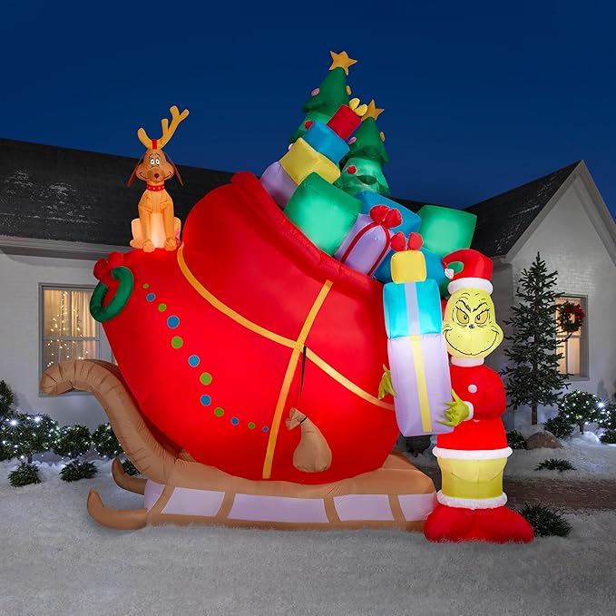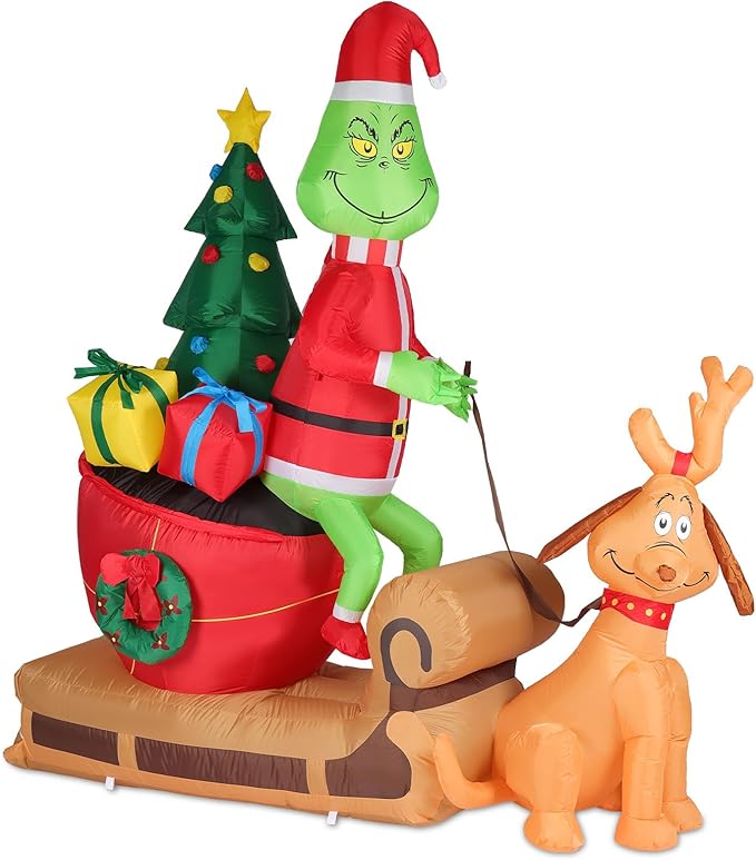 Decorating with Gemmy inflatable Grinch Christmas decorations is a playful way to bring Dr. Seuss’s iconic character to life in your holiday yard display. These inflatables capture the Grinch’s mischievous yet endearing personality, with designs ranging from the Grinch stealing ornaments to him dressed in a Santa suit with Max the dog. Featuring vibrant colors, energy-efficient LED lights, and durable materials, these decorations create a captivating nighttime display. Perfect for fans of How the Grinch Stole Christmas, they add a unique, whimsical touch to your holiday decor, delighting both kids and adults alike.