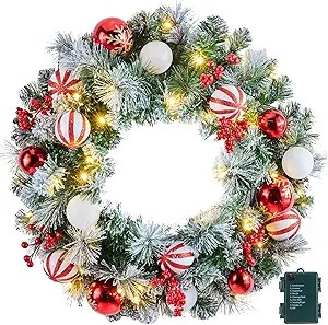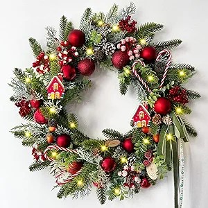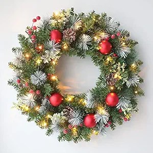 Pre-Lit Artificial Christmas Wreath 24Inch, Christmas Door Decorations Wreath with 50LED Warm Lights, Christmas Balls, Pine Needles, and Red Berries for Front Door Wall Windows X-mas Ornament