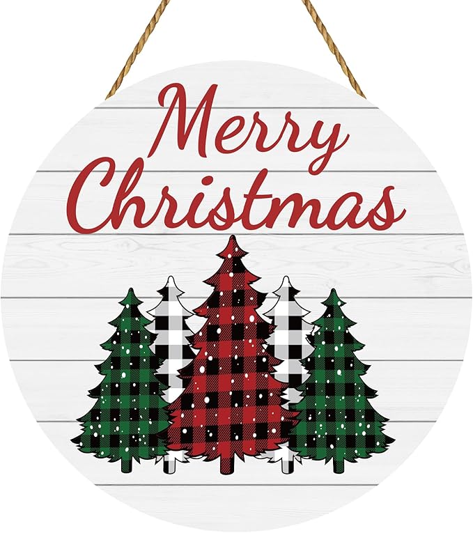 Merry Christmas Sign Christmas Door Decor Buffalo Plaid Christmas Tree Decorations Christmas Door Sign Wooden Christmas Door Hanger for Front Door Porch Wall Indoor Home Decor