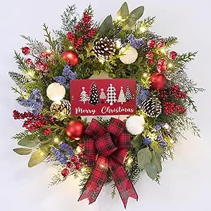 Prelit Christmas Wreath for Front Door Outside,22 inch Buffalo Plaid Wreath with tarten Plaid Bow,Lighted Farmhouse Christmas Decoration with 30 LED Lights,Winter Door Wreath,Christmas Porch Decor