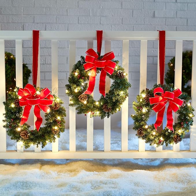 Hausse Set of 3 Christmas Wreaths, Lighted Artificial Christmas Wreath with LED Lights & Large Red Bow Ornaments, 8 Modes & Timer, Battery Operated for Front Door Gate Wall Xmas Party Decorations