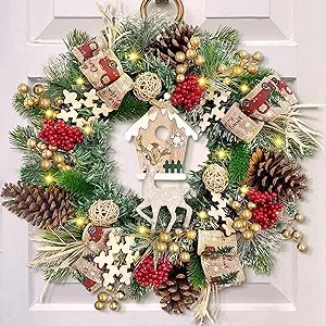 Christmas Wreaths for Front Door – Christmas Wreath with Christmas Reindeer, 16″ Christmas Door Wreath with Santa Wooden House Bow Snowflakes Berries Pine Cones for Home Xmas Decor