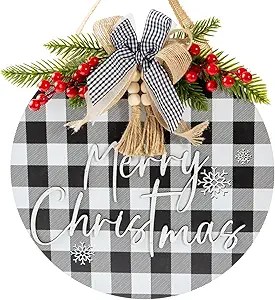 Merry Christmas Wreaths 12” Welcome Sign for Front Door Decor Buffalo Plaid Xmas Decorations for Porch Rustic Holiday Wall Hanger for Home Indoor & Outdoor