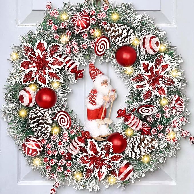 Christmas Wreaths for Front Door, 18″ Christmas Wreath with Skiing Santa Claus, Red Poinsettias Christmas Wreath, Christmas Door Wreath for Indoor Outdoor Decoration