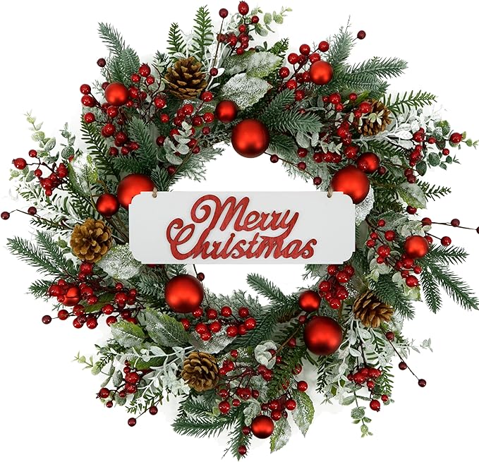 20 inch Artificial Christmas Wreath Winter Wreath with red Ball,red Berry,Pine Needles for Indoor Outdoor Farmhouse Home Wall Window Festival Wedding Decor