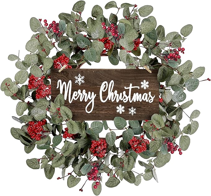 Sggvecsy 18 Inch Artificial Christmas Wreath for Front Door Xmas Red Berry Wreath Winter Glitter Eucalyptus Wreath Christmas Hanging Decorations for Wall Home Window Holiday OutdoorDecor