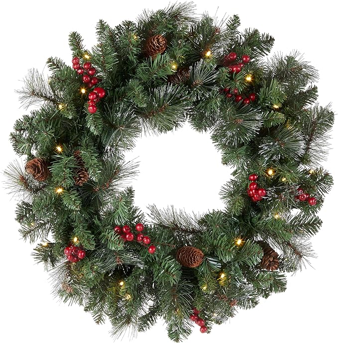National Tree Company Pre-Lit Artificial Christmas Wreath, Green, Crestwood Spruce, White Lights, Decorated with Pine Cones, Berry Clusters, Frosted Branches, Christmas Collection, 24 Inches